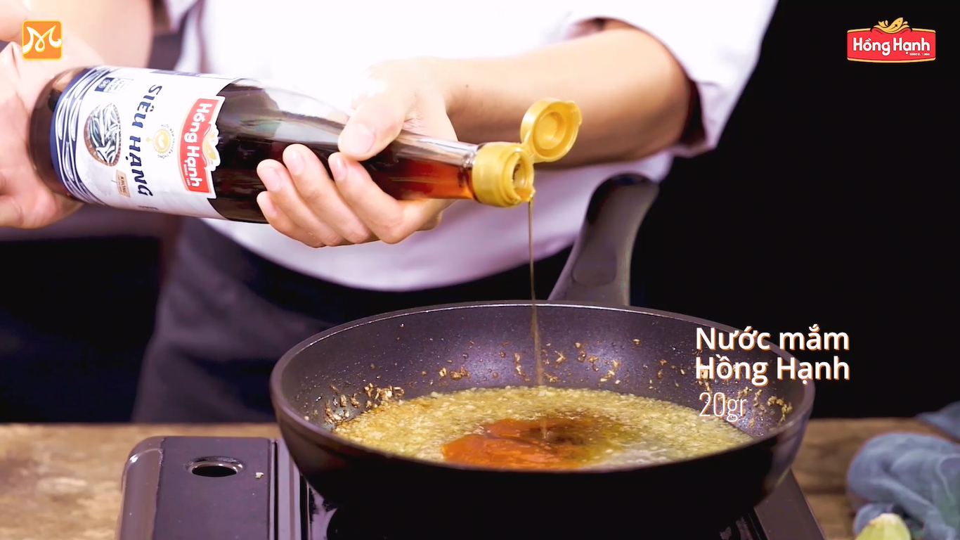 Thêm 20gr nước mắm Siêu Hạng, 50gr đường, 10gr tương ớt, 5gr ớt tươi, nấu liu riu đến khi sốt sệt lại.